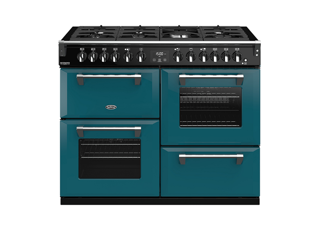 Belling Richmond Deluxe 110cm Dual Fuel Range Cooker - Country Blue: BRD1100DFCB, Seafoam Blue: BRD1100DFSB, Mojito Mint: BRD1100DFMM, Thunder Blue: BRD1100DFTB, Kingfisher Teal: BRD1100DFKT, Midnight Blue: BRD1100DFMB, Graphite: BRD1100DFGR, British Racing Green: BRD1100DFBRG, Dusty Pink: BRD1100DFDP, Porcini Mushroom: BRD1100DFPM, Cream: BRD1100DFCR, White: BRD1100DFWH, Black: BRD1100DFB