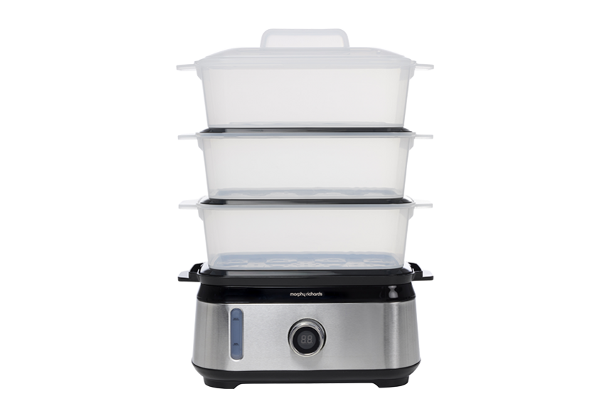 Create a healthy delicious meal from scratch with the Morphy Richards Digital Food Steamer. Featuring three stackable steam trays, each with 3L capacity, you can cook fish, meat, vegetables and even rice all at once or use one or two trays independently to cook the amount of food you require. The digital 60 minute countdown timer can be set in 1 minute increments, so you can cook precise meals and retain the maximum amount of nutrients and vitamins. The large 1.5L water tank can be refilled while cooking using the side water filling inlets.Useful downloads