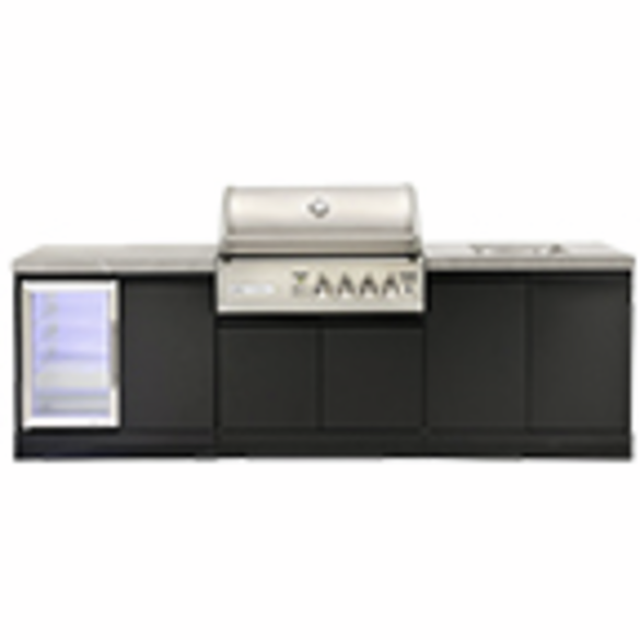Premium 4B gas black outdoor kitchen, Double side cabinets with 1 x flat bench top, under bench sink and single fridge