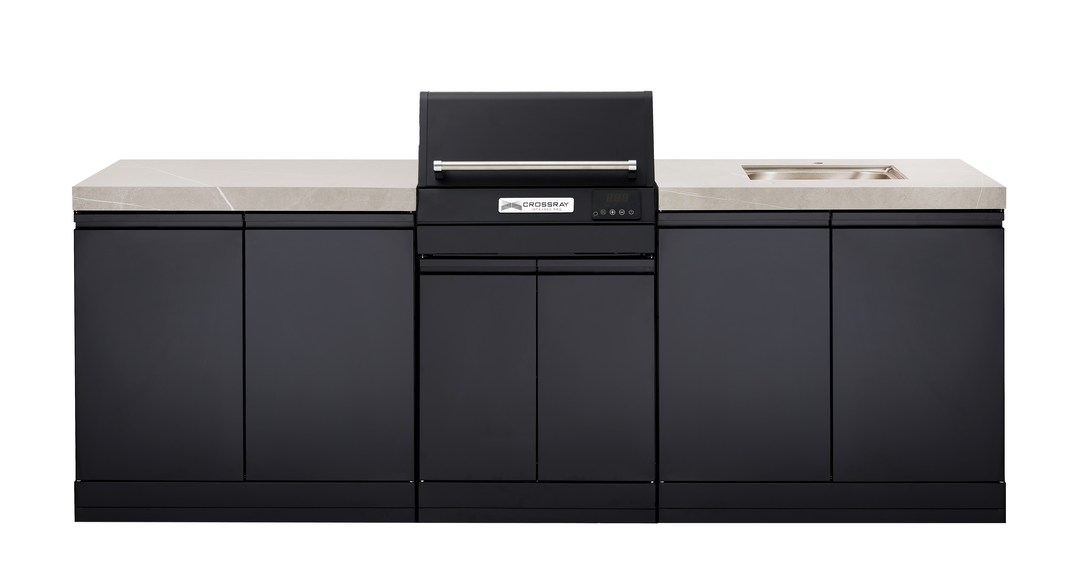 TCEK-14Elevate your outdoor cooking experience with the Extreme Electric Outdoor Kitchen, featuring a sleek grey benchtop that combines style and functionality for your culinary adventures. This innovative kitchen is perfect for those who love to cook and entertain, offering a variety of customizable options to suit your preferences, including the choice between a single stainless steel fridge or a black double fridge for ample storage space. You can enhance your storage capabilities with double side cabinets and opt for a flat benchtop for a minimalist look or incorporate a durable under-bench 304SS sink for added convenience. At the heart of this kitchen is the CROSSRAY eXtreme Electric BBQ Model TCE22HT, which boasts cooking performance exceeding 300?C?comparable to or better than standard gas BBQs on the market. The digital, programmable display makes cooking effortless, ensuring precise temperature control for perfect results every time.