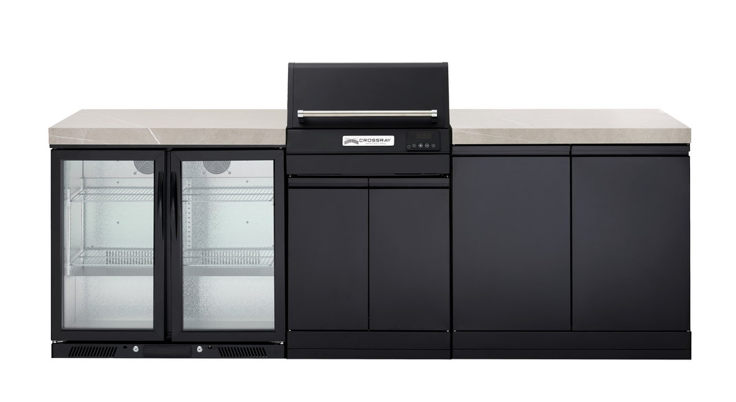 Elevate your outdoor cooking experience with the Extreme Electric Outdoor Kitchen, featuring a sleek grey benchtop that combines style and functionality for your culinary adventures. This innovative kitchen is perfect for those who love to cook and entertain, offering a variety of customizable options to suit your preferences, including the choice between a single stainless steel fridge or a black double fridge for ample storage space. You can enhance your storage capabilities with double side cabinets and opt for a flat benchtop for a minimalist look or incorporate a durable under-bench 304SS sink for added convenience. At the heart of this kitchen is the CROSSRAY eXtreme Electric BBQ Model TCE22HT, which boasts cooking performance exceeding 300?C?comparable to or better than standard gas BBQs on the market. The digital, programmable display makes cooking effortless, ensuring precise temperature control for perfect results every time.